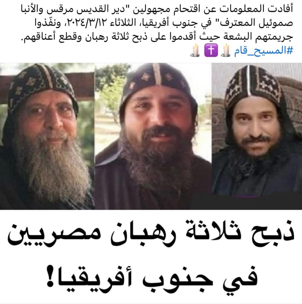 Trois moines coptes-orthodoxes ont été tués dans une église d’un couvent à environ 50 km de Pretoria, la capitale du pays, Hegumen Takla El-Samuely, Yostos Ava Markos et Mina Ava Markos ont été assassinés à l’arme blanche, et un quatrième tabassé à coups de barre de fer.