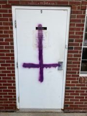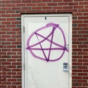 Diverses publications catholiques sur les réseaux sociaux signalent des tags satanistes (pentacle, 666, croix renversée) sur les extérieurs de l’église de la FSSPX à Armada, Michigan.