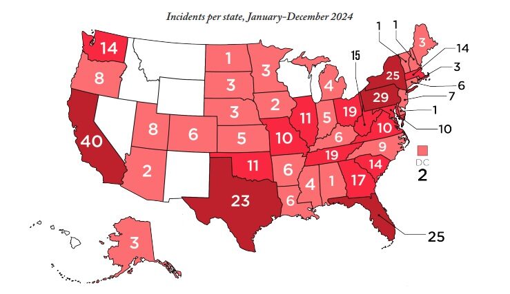 Parmi les états américains, 40 cas sont relevés en Californie, 29 en Pennsylvanie, 25 dans les états de Floride et New York, 23 au Texas, 19 au Tennessee et dans l’Ohio. Dans plusieurs états, dont le Wyoming, le Nouveau Mexique, le Nevada, l’Idaho et le Montana, aucune atteinte christianophobe n’est recensée.