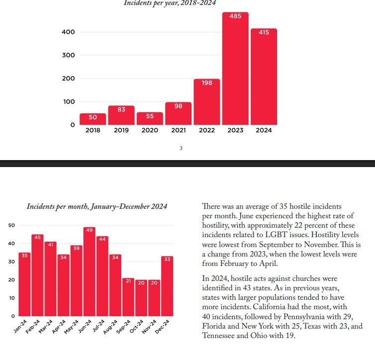 Le rapport annuel du Family Research Council sur les atteintes aux églises chrétiennes aux Etats-Unis vient de paraître et recense 415 faits en 2024, un chiffre en légère baisse par rapport à 2023 (485), mais plus élevé que les années précédentes depuis 2020.