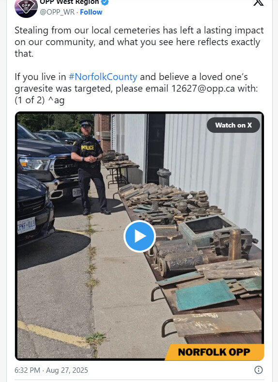 Des “vols de monuments commémoratifs en laiton et en bronze [ont eu lieu] dans des cimetières du comté de Norfolk, notamment à Delhi, Courtland Baptist, Bayview (Port Rowan), Port Dover, Waterford Greenwood et Sacred Heart (Langton).