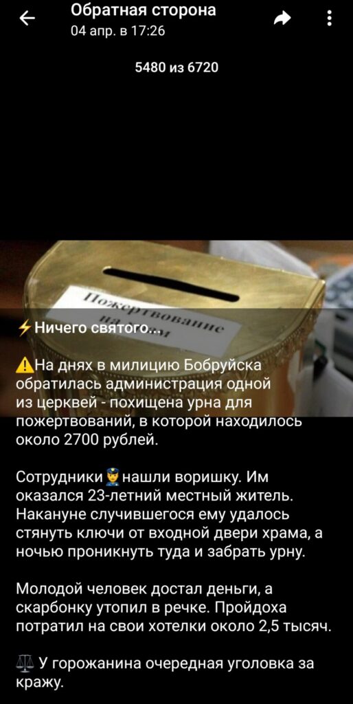 Début avril dernier une des eglises de Bobruisk en Biélorussie a subi le vol d’un tronc avec 2700 roubles biélorusses dedans [l’équivalent de 750 euros].