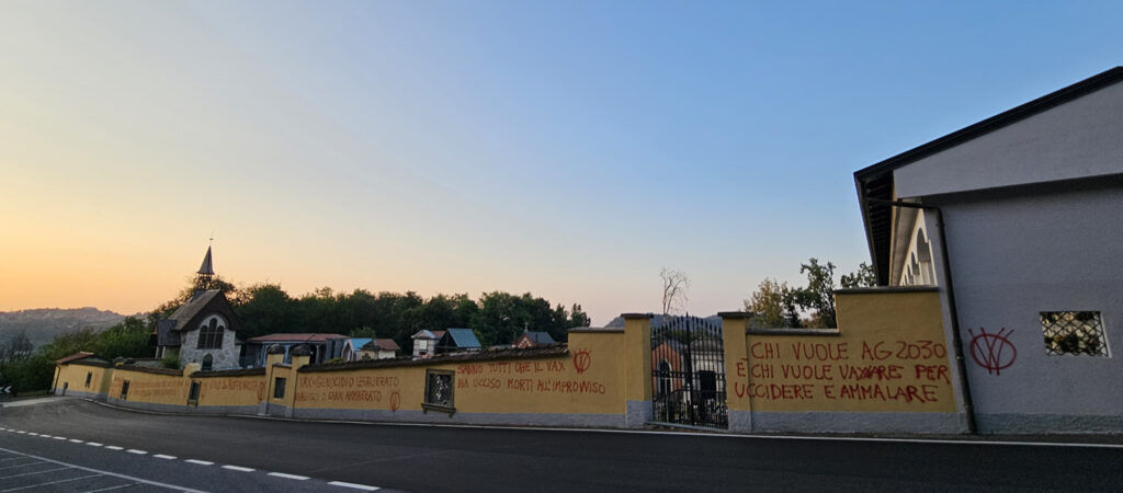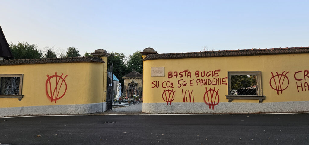 Courant août, des tags en rouge ont été faits sur les cimetières de Merate et d’Imbersago en Lombardie, en Italie – communes ou d’autres tags similaires, anti-vax, anti-5G, anti-agenda 2030 et anti-mondialisation ont été commis sur des écoles, des bâtiments publics, la rédaction du journal local etc, occasionnant des milliers d’euros de dégâts pour les communes concernées. Le cimetière de Verderio en a fait l’objet le 29 août dernier.