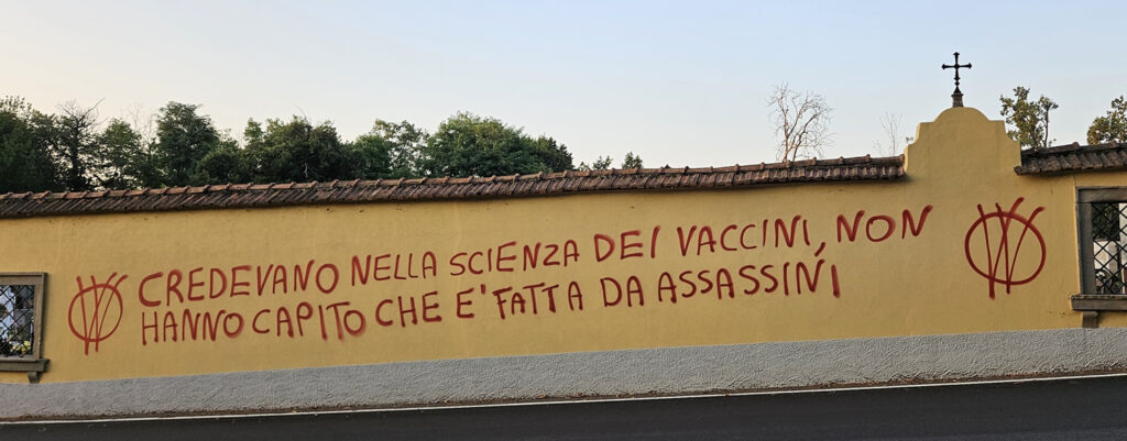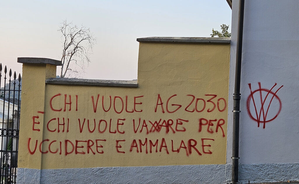“« Assez de mensonges sur le CO2, la 5G et les pandémies », « Vax = génocide légalisé », « Qui veut l’Agenda 20230 et qui veut vacciner pour tuer et rendre malade » sont quelques unes des inscriptions. Des tags similaires ont été commis le 10 septembre sur les murs de trois cimetières de Ferrare.