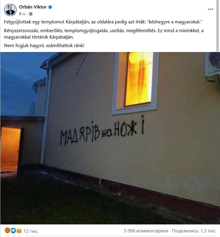Viktor Orban sur Twitter a publié une photo des tags avec comme légende : “en Transcarpathie une église a été incendiée. Sur le mur une inscription appelant à poignarder les hongrois. Mobilisation forcée, meurtres, incendies d’églises, développement de la haine, tentatives de faire peur. Tout cela se passe avec les notres, les hongrois en Transcarpathie. Nous ne le permettrons pas. Vous pouvez compter sur nous“.