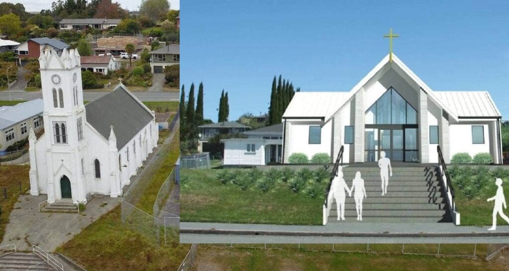 L’église Sainte-Marie de Pleasant Point, bâtie en 1889, a été endommagée en 2011 après un tremblement de terre. Bien qu’elle aurait sans doute pu être relevée – et l’aurait certainement été sur le Vieux Continent – les néo-zélandais ont préféré l’abattre fin 2021 pour la reconstruire en plus moderne, plus lumineux… et plus petit.
