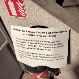 A l’entrée, un écriteau sur un extincteur prévient : “message aux 2 ados qui s’amusent à vider les extincteurs et a mettre le feu dans l’église : deux personnes vous ont vus et pourront vous reconnaître. La première vous a surpris dans l’église mercredi 31 mars à 17 heures, la seconde vous a vu entrer dans l’église dimanche 18 avril à 16 heures.