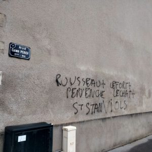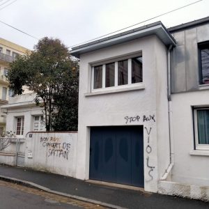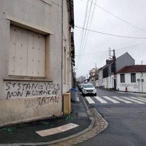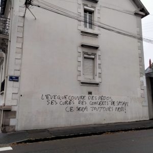 Mgr Percerou disait alors dans la presse locale qu’il était prêt à recevoir ceux qui pourraient l’éclairer sur les abus dénoncés à Saint-Stanislas. Il n’aura besoin que de lever les yeux – la réponse est sur un mur le long des boulevards, près de la maison diocésaine. Les tags étaient toujours visibles vers 9h30 ce mardi matin.