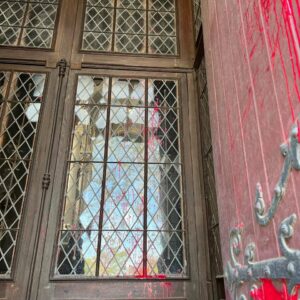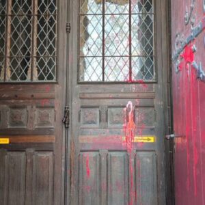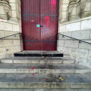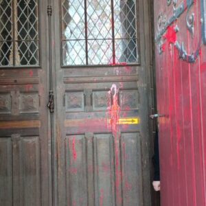 Sous l’oeil impassible de la police certains des manifestants antifas se sont rassemblés devant la porte de l’église, criant des slogans antifascistes, et ont jeté des oeufs et de la peinture rouge sur la porte de l’édifice.