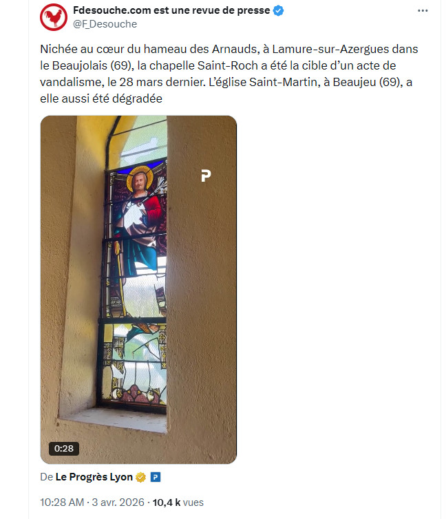 La commune de Lamure sur Azergues, connue pour avoir le plus long canton ferroviaire de France (65 km) aux confins du Rhône, de l’Allier, et de la Saône et Loire, a aussi une chapelle saint Roch qui a été vandalisée le 28 mars dernier; d’après la presse locale, un vitrail a été brisé.