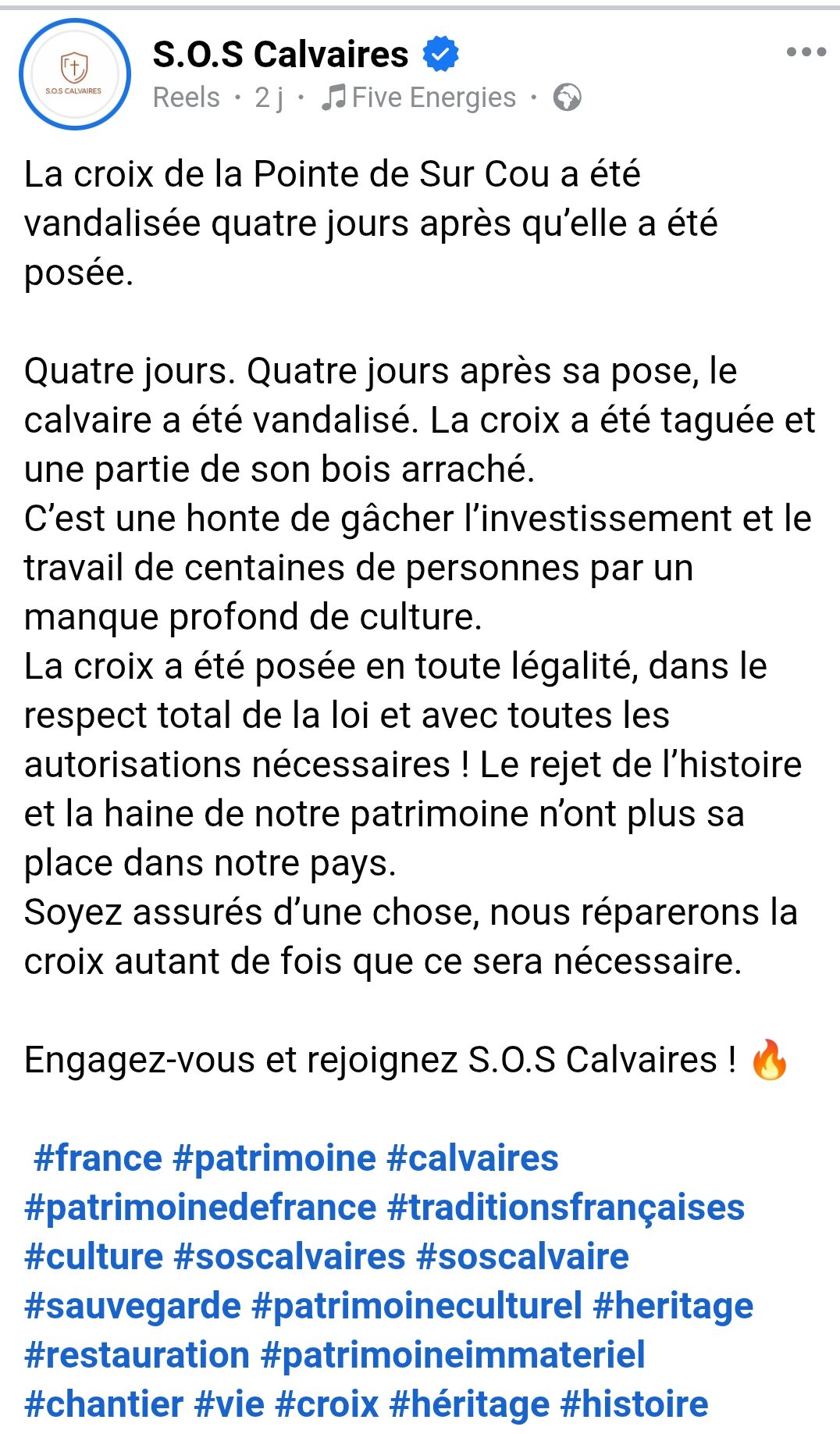 C’est cette même association qui a annoncé ce jeudi 19 juin que la croix avait été taguée. Les phrases “Et la loi 1905 ?” et “Croix hors la loi” ont été écrites. Pour rappel, la loi 1905 instaure la séparation de l’Eglise et de l’Etat.