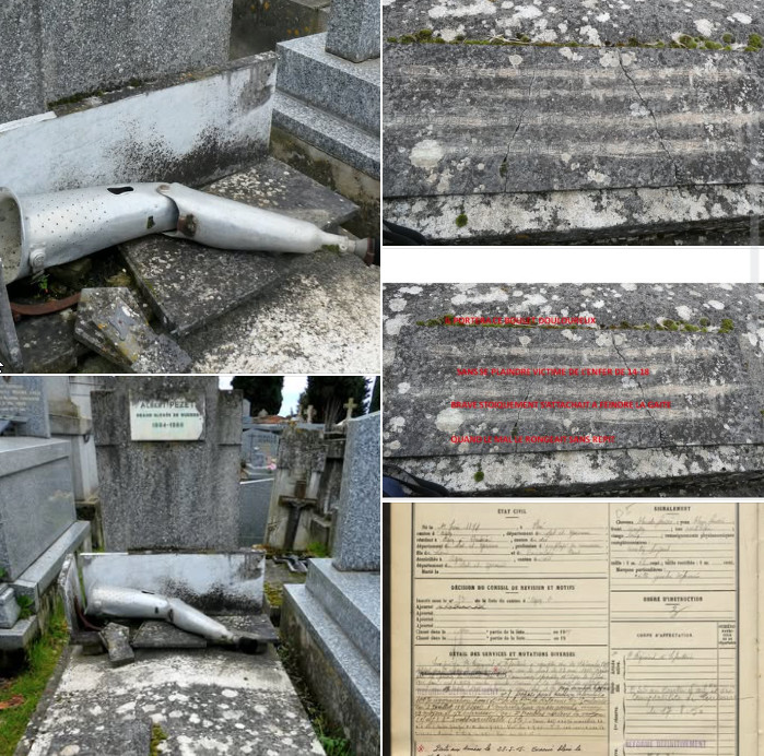 La tombe d’Albert PEZET située dans la parcelle “Salonique” ,secteur 7 division 2 a été profanée.Cette tombe faiit partie de nos visites émouvantes Albert PEZET,né le 1 er juin 1894 a été mobilisé au 7e régiment d’infanterie le 23 mai1915 et a été grièvement blessé le 11 août 1915 par un éclat d’obus. Amputé à la cuisse gauche à Vienne le Chateau (51) au lieu-dit SAINT HUBERT proche du ravin Marie-Thérese. il a été pensionné à 120% et déclaré non appareillable. Néanmoins une prothese sera confectionnée, difficilement portable.Après son décès le 11 décembre 1966 à Toulouse, son souhait sera exaucé : que sa prothèse soit placée sur sa tombe et qu’une inscription soit gravée.