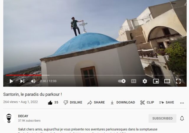 Des pratiquants français du parkour – sport qui consiste à sauter d’obstacle en obstacle, ou à faire des acrobaties en milieu urbain (friches, toit) ont publié une vidéo où ils s’exercent sur les toits en escalier de Santorin, y compris…